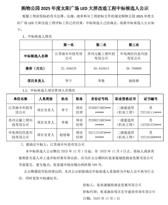 购物公园 2025 年度太阳广场 LED 大屏改造工程中标候选人公示